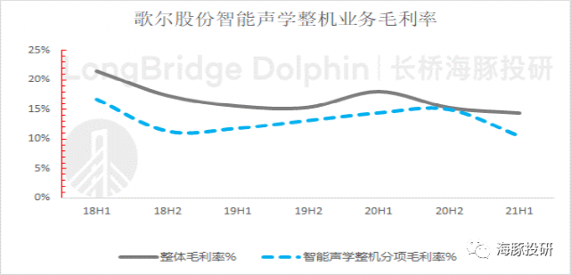 歌爾股份智能聲學(xué)整機(jī)板塊2021年上半年毛利率10.5%,同比下滑3.9pct。