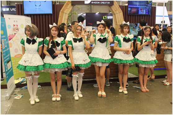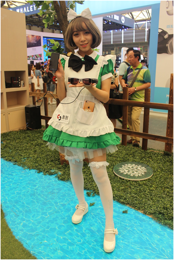 在影創(chuàng)與眾不同的展區(qū),妹子手中的設(shè)備是黑科技風(fēng),而穿著卻是田園女仆風(fēng)