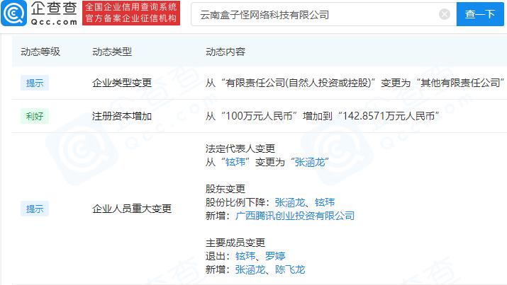 與此同時,廣西騰訊創(chuàng)業(yè)投資有限公司還完成了對盒子怪的投資,持股比例為30%。