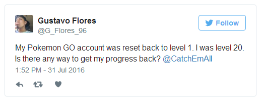 Pokemon Go玩家Gustavo Flores表示在他升到20級的時候他的賬戶被重置了。