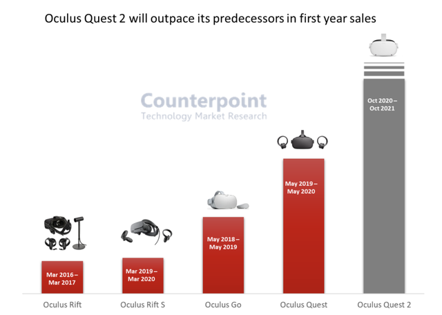 從國外來看,消費級市場正在培育階段,處于增長上行階段。Oculus Quest 2在將價格下探到299美元的價格,發(fā)售三個月后銷量達(dá)到了近300萬臺。行業(yè)媒體映維網(wǎng)預(yù)測,2021年Oculus Quest 2的全年銷量有望達(dá)到700萬-800萬臺。