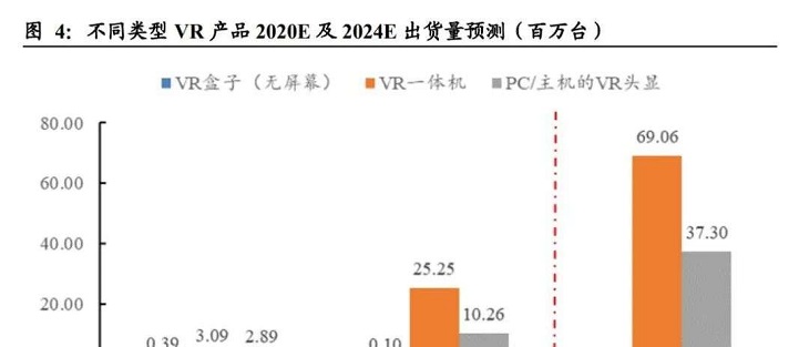 根據(jù) IDC 的數(shù)據(jù)預(yù)測,于 2020 年開始,VR 一體機(jī)將持續(xù)保持高速增長,VR 盒子 將逐步退出,預(yù)計到 2024 年,VR 一 體機(jī)成為市場主流設(shè)備,全球年出貨量達(dá) 2525 萬。
