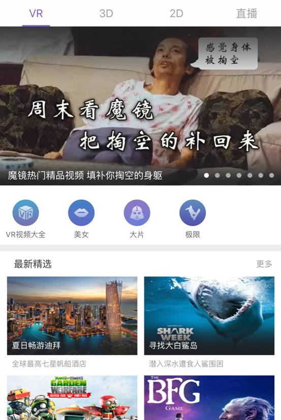 主界面整體布局還算比較清晰簡潔,目前該APP主要給用戶展示的是各種類型的VR視頻,以及部分普通視頻,其中Android版本已開放VR游戲的體驗,IOS版本則需要稍等到下期開放。