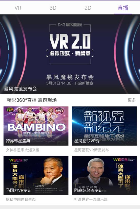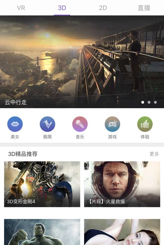 在VR影院中,視頻又進行了更細致的分類,主要分為“VR”,“3D”“2D”“直播”四個大類