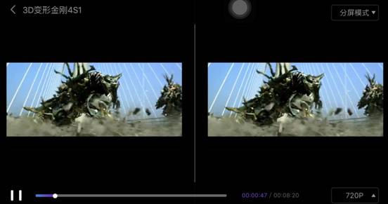 在有VR眼鏡的條件下,用戶可以選擇分屏模式,將手機正確放入到暴風魔鏡眼鏡盒中,可獲得更強沉浸感的觀影感受。如果沒有VR眼鏡的話,就用單屏模式也能正常觀看,十分便捷。