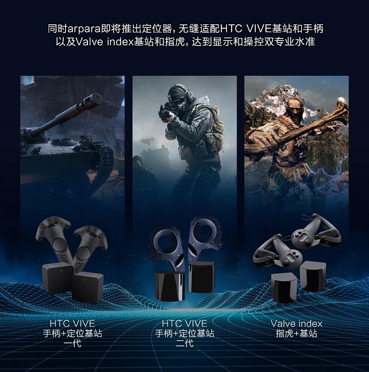 對于重度VR用戶而言,僅有極致的屏幕表現還遠遠不夠,PC VR的定位系統(tǒng)也同樣重要。據arpara?團隊稱,在今年將會推出一款arpara定位器,通過它,arpara 5K VR頭顯將可以兼容Lighthouse燈塔定位基站套裝以及與定位基站配套的指虎和手柄,已有以上配件的用戶,將可以無縫與arpara 5K VR頭顯銜接,讓游玩PC VR游戲時擁有更準確的定位。