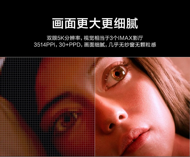 根據arpara?在官方渠道公布的數據,使用Micro-OLED屏幕的arpara 5K VR頭顯雙眼分辨率可達5120*2560,PPI達到3514,PPD為32,。據悉,在使用arpara?設備進行觀影時,可享受3000+英寸的IMAX 3D巨幕,配合最高120Hz的刷新率以及微秒級響應速度,可擁有兼具沉浸感與出色清晰度的視覺觀感。