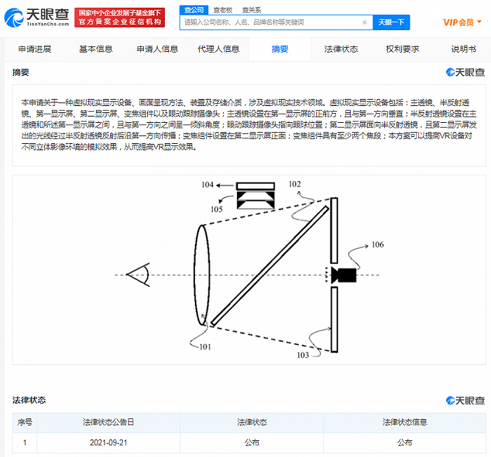 天眼查顯示,9月21日,騰訊公開(kāi)“虛擬現(xiàn)實(shí)顯示設(shè)備、畫(huà)面呈現(xiàn)方法、裝置及存儲(chǔ)介質(zhì)”專(zhuān)利,公布號(hào)CN113419350A,申請(qǐng)日期為2021年6月。