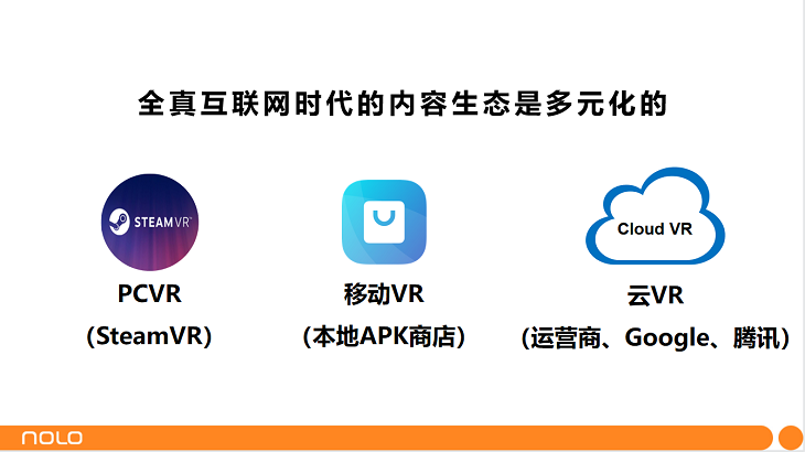 NOLO張道寧表述:“未來(lái)內(nèi)容生態(tài)PC端VR +移動(dòng)端VR+云VR,三種內(nèi)容生態(tài)齊頭并進(jìn)的狀態(tài)?!?/p>