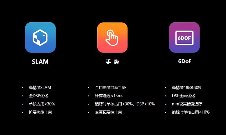 高精度SLAM算法可以實現(xiàn)全DSP優(yōu)化,單核占用小于30%;自然手勢算法計算延遲低于15ms,追蹤時單核占用小于30%,DSP小于10%;基于CV追蹤的6DoF手柄算法全面優(yōu)化了DSP,可以實現(xiàn)毫米級高精度追蹤,追蹤時單核占用低于10%。