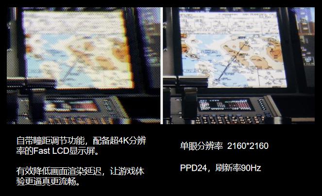 在XR 2的加持下,騏驥配備兩塊獨立2.89英寸的Fast LCD顯示屏,超4K分辨率(單眼分辨率2160*2160),1058 PPI,PPD達(dá)到24,為目前同類產(chǎn)品最高。從測試圖片可以明顯看出,右側(cè)“騏驥”所顯示的單眼2K的效果更佳。96°大視場角加上90Hz刷新率,帶來沉浸、流暢的畫面觀看體驗。