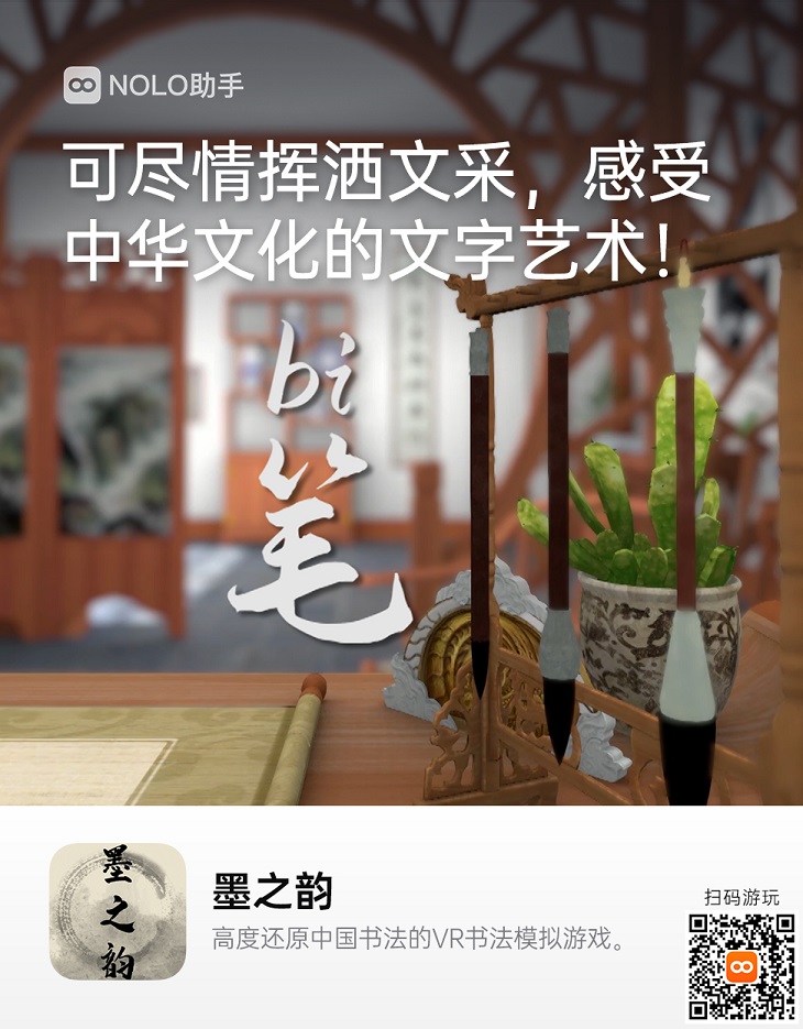 《墨之韻》是一款高度還原中國(guó)書(shū)法的VR書(shū)法模擬游戲,目前該游戲已經(jīng)上架NOLO Sonic 應(yīng)用商店,NOLO用戶在9月26日—10月7日期間,享受7折驚喜價(jià)21元,10月7號(hào)以后開(kāi)始恢復(fù)為30元。在游戲中你隨意轉(zhuǎn)換身份,感受傳統(tǒng)文化帶來(lái)的樂(lè)趣。