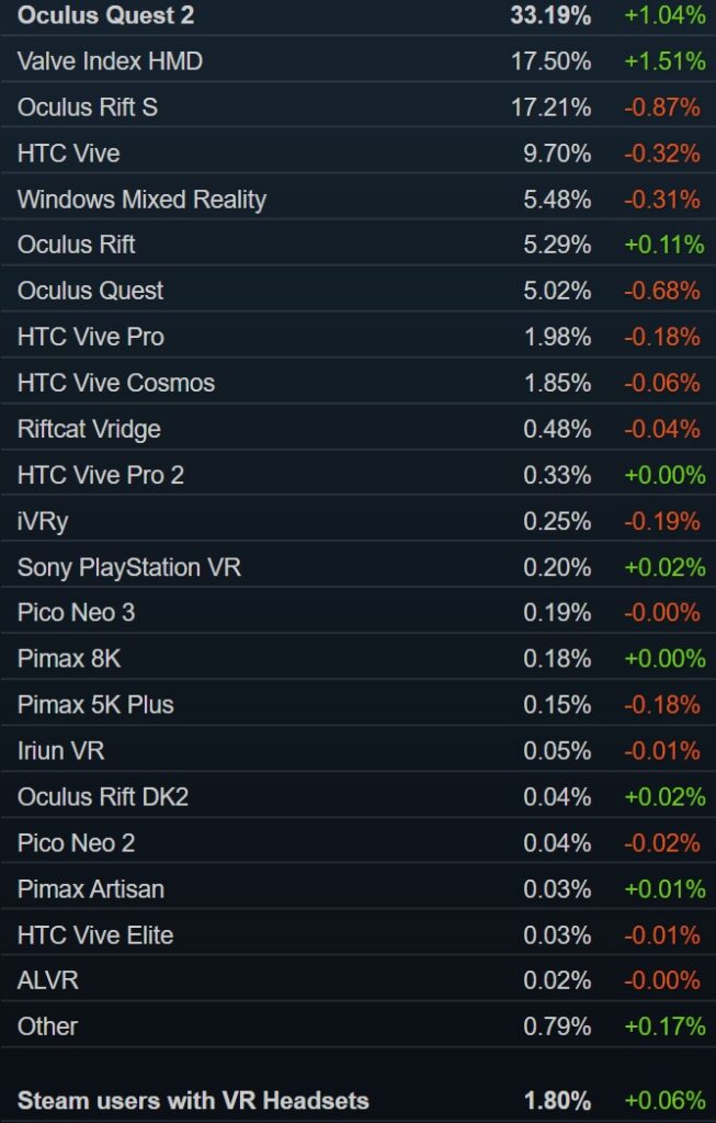 而Quest 2在8月暫停銷售期間略有萎縮后,9月也取得了大幅增長,現(xiàn)在Quest 2使用率已達到33.19%,比以往任何時候都要高。另外,Steam VR頭顯用戶數(shù)增長了0.06%,達到1.8%。