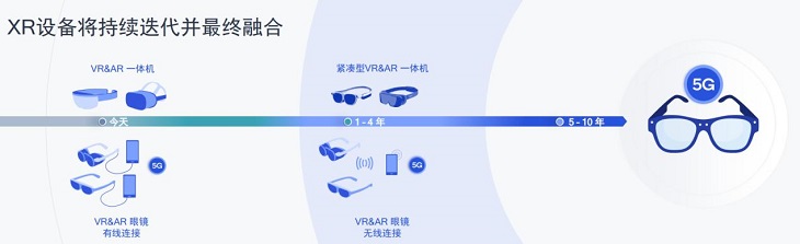 未來,伴隨著終端側(cè)算力的不斷提升以及XR與5G、邊緣云和AI技術(shù)的協(xié)同發(fā)展,XR的產(chǎn)品形態(tài)將會(huì)不斷演進(jìn)并融合,無線連接將代替有線連接,部分處理工作在頭顯設(shè)備中進(jìn)行,大部分處理工作由智能手機(jī)和PC完成,預(yù)計(jì)在5-10年后,可以實(shí)現(xiàn)輕量化眼鏡的形態(tài)。