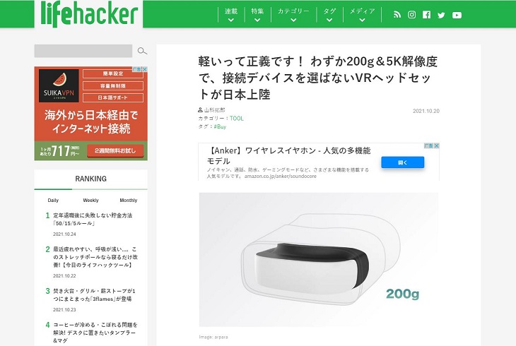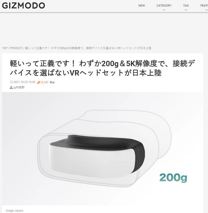 其中GIZMODO與lifehacker被arpara 5K VR頭顯輕巧的體積與5K分辨率所吸引,這兩家媒體對(duì)arpara 5K VR頭顯僅200克的輕巧重量贊譽(yù)有加,而且也對(duì)高達(dá)5120*2560的分辨率以及最高可達(dá)120Hz的屏幕刷新率這兩項(xiàng)參數(shù)表示肯定。GIZMODO與lifehacker均為全球范圍內(nèi)的知名科技類媒體,兩者旗下的日本站在日本地區(qū)也是領(lǐng)域中公認(rèn)的佼佼者。