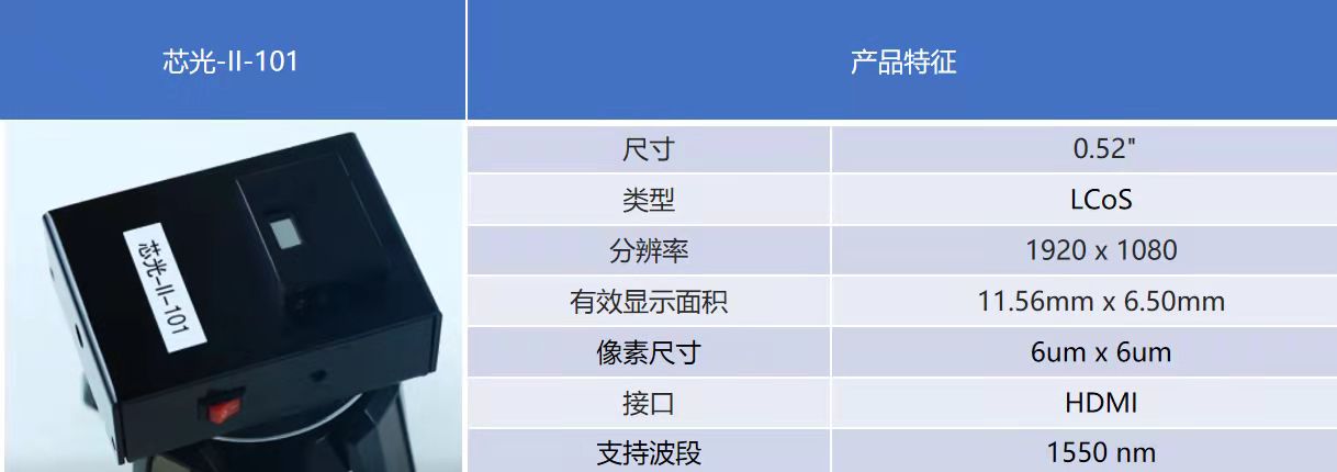 芯光-II-101,搭載了自主研發(fā)、具有完全知識(shí)產(chǎn)權(quán)的高性能的硅基液晶芯片(LCoS) ,在360hz驅(qū)動(dòng)頻率下可達(dá)到低于200 mW的功耗,芯光-II-101的分辨率為1920×1080,可應(yīng)用于光通訊、工業(yè)控制等尖端領(lǐng)域。