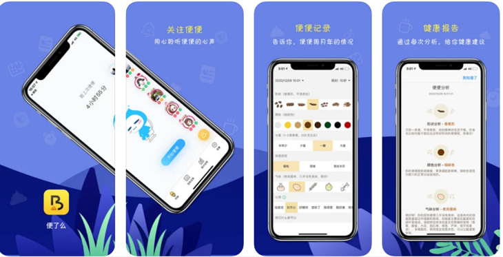 在開始頁面,用戶可以通過點擊“開始便便”來記錄單次便便的時間,在此過程中,會有一個藍色的動畫小人坐在馬桶上和用戶“一起努力”,當用戶點擊“拉完了”按鈕時,系統(tǒng)除了會彈出用戶耗時,并指引用戶根據(jù)實際情況選擇便便的形狀、顏色、分量、排便感覺、氣味、粘粘度以及心情等內容。當用戶點擊保存頁面后,系統(tǒng)會彈出一份健康定制報告,用更多維、更清晰的圖表對用戶本次排便情況進行分析并根據(jù)具體問題給出相應的建議。如果用戶愿意的話,也可以把報告分享到其他社交平臺…