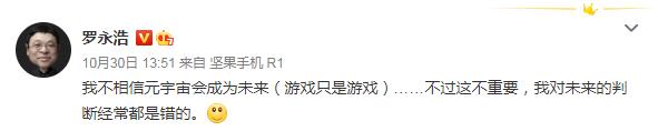 然而,戲劇性的是,10月30日羅永浩在微博發(fā)貼表示,“我不相信元宇宙會成為未來(游戲只是游戲)……不過這不重要,我對未來的判斷經(jīng)常都是錯的”