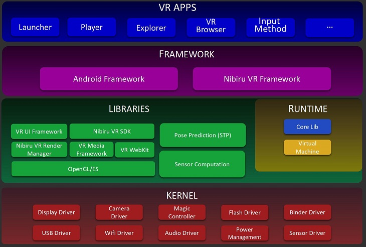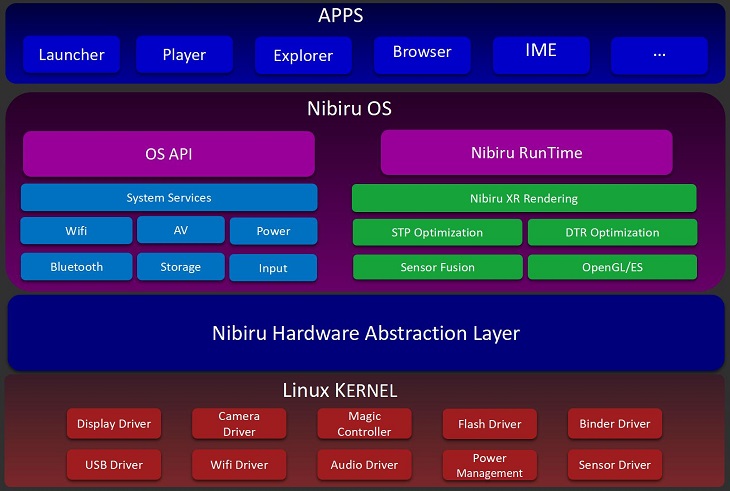 Nibiru XR OS 是自上而下研發(fā)出的操作系統(tǒng),?經(jīng)多年發(fā)展目前與各芯片廠家建立了廣泛的技術(shù)合作,參考設(shè)計(jì)覆蓋主流芯片方案,包括ARM、Intel、Imagination、Qualcomm、Samsung、MTK、Actions、Allwinner、Rockchip等。Nibiru?作為國內(nèi)領(lǐng)先的一體機(jī)系統(tǒng)提供商,與下游硬件產(chǎn)品設(shè)計(jì)公司和品牌公司建立了廣泛的合作。同時(shí)Nibiru在VR一體機(jī)系統(tǒng)、底層優(yōu)化、開發(fā)工具、人機(jī)交互等諸多方面具有領(lǐng)先優(yōu)勢(shì),可提供整體VR行業(yè)解決方案,為APP開發(fā)者提供工具和服務(wù),是整個(gè)VR一體機(jī)重要的一環(huán)。Nibiru 擁有全自主引擎,Nibiru Linux 系統(tǒng)依托于 Nibiru Studio 和 Nibiru Creator 雙引擎工具的支持與協(xié)同,具備很強(qiáng)的架構(gòu)優(yōu)勢(shì)。