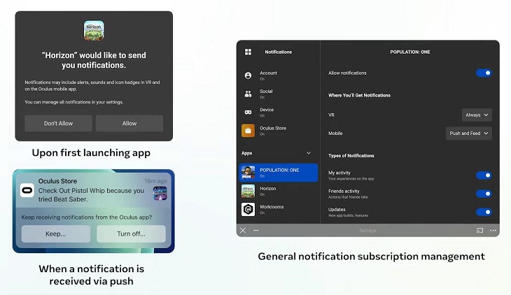 與智能手機(jī)通知一樣,VR應(yīng)用需要請(qǐng)求許可才能發(fā)送通知。在“設(shè)置”中,用戶可以在每個(gè)應(yīng)用級(jí)別禁用或自定義通知。