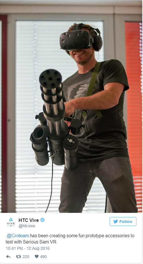 近日,HTC Vive官方就分享了下面這張圖。途中一位玩家正拿著小機(jī)槍外形的遙控在體驗(yàn)VR游戲——也許是《英雄薩姆》。這個(gè)機(jī)槍形遙控還帶有一個(gè)可以旋轉(zhuǎn)的滾筒(應(yīng)該是通過旋轉(zhuǎn)來發(fā)射子彈)。