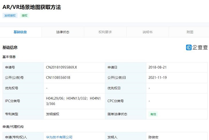 11月19日,華為技術(shù)有限公司“AR/VR場景地圖獲取方法”專利獲得授權(quán),公開號為 CN110855601B,申請日為2018年8月21日。
