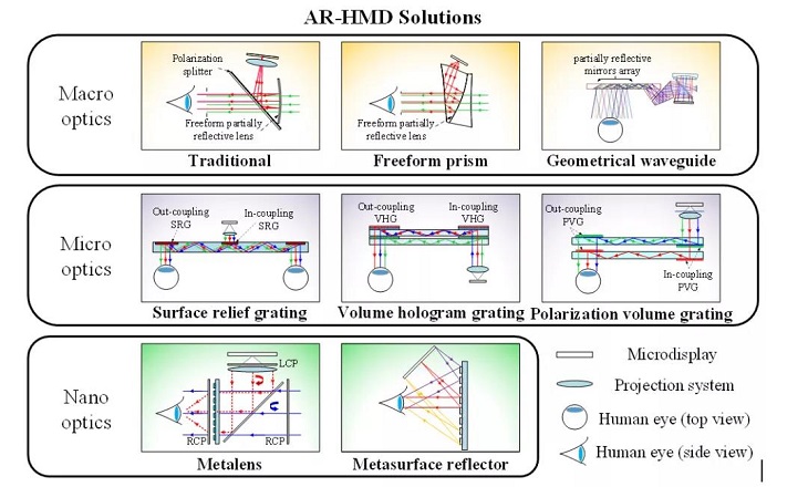 經(jīng)過多年發(fā)展與迭代, 目前AR眼鏡的光學(xué)解決方案主要分為宏觀光學(xué)方案、微光學(xué)方案和納米光學(xué)方案三大類。