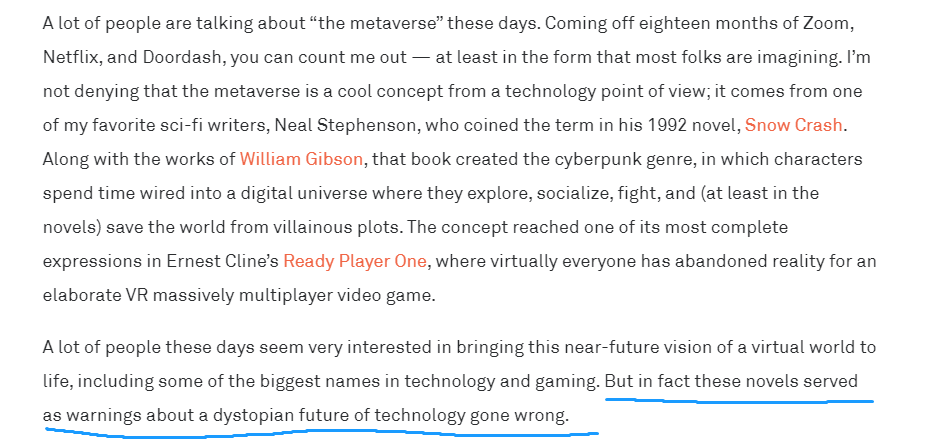 約翰·漢克與扎克伯格的想法則完全相反,他在8月發(fā)布于Niantic官網(wǎng)的博客中寫道,元宇宙的概念的確來源于科幻小說《雪崩》,該小說也創(chuàng)造了賽博朋克的小說流派。但包括《頭號(hào)玩家》電影在內(nèi)的賽博朋克流目的是為了提醒人類,警惕在科技走向錯(cuò)誤方向時(shí)出現(xiàn)的「反烏托邦式」未來。
