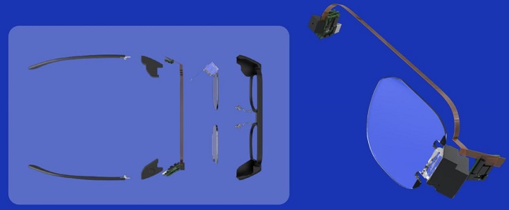 阿拉丁Zero參考機型遵循緊湊布局設計理念,其外形極致輕薄,重量僅為38.6g與普通眼鏡輕薄程度無限接近。眼鏡內(nèi)置了靈犀微光自研的AW70s,創(chuàng)新性的將光機的顯示源和投影源(LCOS)合二為一,打造出最小體積的投射模組, 并且基于陣列光波導技術實現(xiàn)了10g以內(nèi)1280X720、30°FOV高清顯示AR光波導模組制程,且良率可保持在85%以上。