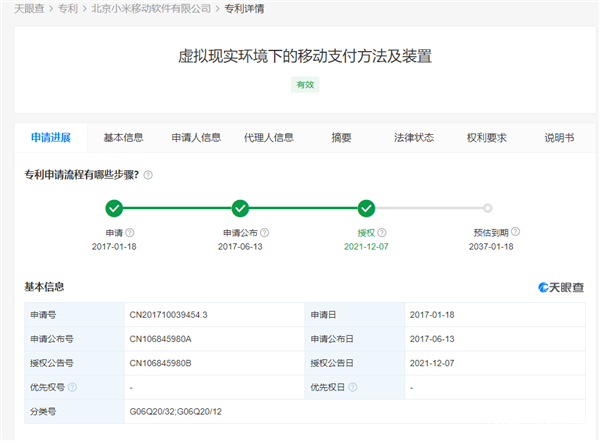 天眼查App顯示,近日,北京小米有限公司“虛擬現(xiàn)實(shí)環(huán)境下的移動(dòng)支付方法及裝置”專利獲授權(quán)。該專利申請(qǐng)日為2017年1月18日,申請(qǐng)公告日為2017年6月13日,授權(quán)公告日為2021年12月7日。