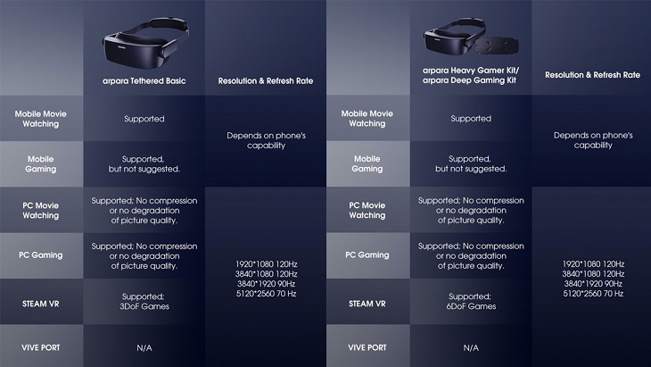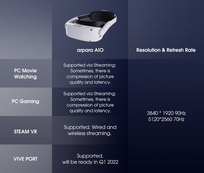 在Kickstarter首次亮相的arpara AIO通過自帶攝像頭與位置算法實現(xiàn)6DoF頭手定位,在前后位移時也能精確捕捉所在位置,實現(xiàn)VR游戲的精準暢玩;在屏顯性能方面,arpara AIO目前可支持5120*2560 70Hz與3840*1920 90Hz兩檔分辨率,兩檔分辨率/刷新率的加入可適應(yīng)更多元的使用場景。