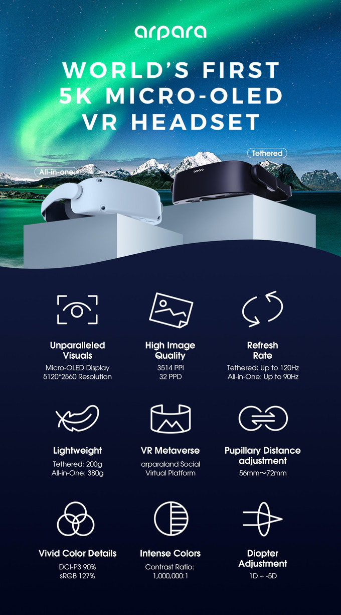 此次Kickstarter眾籌不僅包含了這款海外版超高清5K VR頭顯,還為全球VR玩家準備了與頭顯匹配的arpara Tracker,據(jù)arpara內(nèi)部消息稱目前已有數(shù)千位用戶在官網(wǎng)預(yù)訂了VR產(chǎn)品。更加引人矚目的是arpara AIO選擇首次面向全球用戶在Kickstarter上架,據(jù)arpara海外官網(wǎng)顯示,arpara AIO同樣采用了Micro-OLED屏幕作為顯示方案,其他參數(shù)也與arpara 5K VR頭顯非常接近,相信廣大用戶已經(jīng)迫不及待。