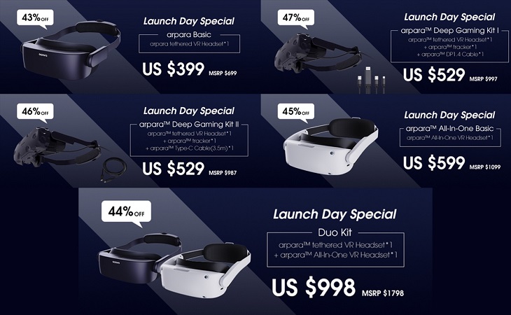 最后,在價(jià)格方面,此次售賣的國(guó)際版arpara AIO與arpara 5K VR頭顯面向全球前3天購(gòu)買的支持者實(shí)行大幅度優(yōu)惠政策,其中arpara AIO售價(jià)為599美元相比標(biāo)準(zhǔn)售價(jià)1099美元降低了45%,arpara 5K VR頭顯售價(jià)為399美元相比標(biāo)準(zhǔn)售價(jià)699美元降低了43%,其他組合套裝也有最高47%的優(yōu)惠幅度。