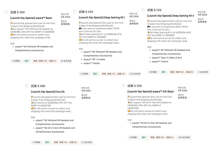 而擁有同樣硬核參數(shù)的arpara 5K VR頭顯和兩個(gè)搭配arpara Tracker的組合套裝總共收獲了150位支持者,同時(shí)擁有兩款arpara VR產(chǎn)品的組合套裝也得到了15位支持者的青睞。