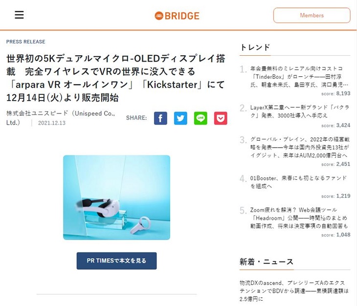 除此之外BRIDGE(ブリッジ)、CNET JAPAN等諸多國(guó)際科技媒體也對(duì)arpara此次上架Kickstarter的arpara 5K VR頭顯和arpara AIO兩款產(chǎn)品抱有濃厚興趣。