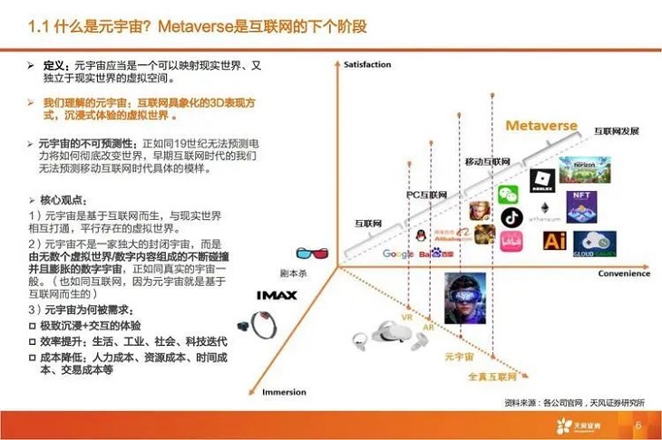 同時(shí)以10年為預(yù)測,我們認(rèn)為元宇宙是一個(gè)階段性的。它先從社交、娛樂、游戲、廣告、視頻,在未來的十年會(huì)進(jìn)入到全真互聯(lián)網(wǎng),打破虛擬和現(xiàn)實(shí)的邊界。比如在工業(yè)物聯(lián)網(wǎng)、在電商物聯(lián)網(wǎng)、在各行各業(yè)的物聯(lián)網(wǎng)、在生活服務(wù)、在金融系統(tǒng)、在新消費(fèi)上。 終極角度就是數(shù)字宇宙,萬物互聯(lián),現(xiàn)實(shí)與虛擬不分邊界,這是從賽道的角度。