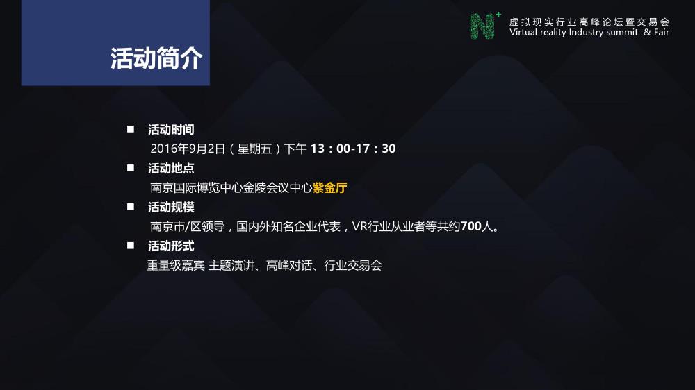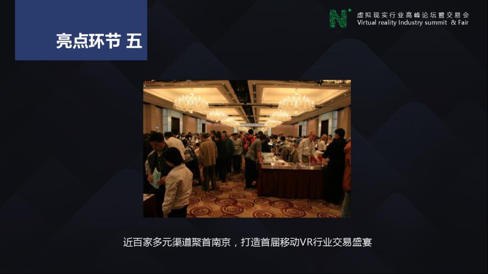 為了能更快更健康地發(fā)展行業(yè),實(shí)現(xiàn)行業(yè)內(nèi)外的交流,"N+虛擬現(xiàn)實(shí)行業(yè)高峰論壇暨交易會(huì)"9月2日相約南京金陵會(huì)議中心,又一個(gè)虛擬現(xiàn)實(shí)現(xiàn)象級(jí)的行業(yè)盛會(huì),將引燃投身于這項(xiàng)偉大事業(yè)的你我激情。中國虛擬現(xiàn)實(shí)行業(yè)全生態(tài)鏈企業(yè)匯聚一堂,通過高峰論壇、圓桌會(huì)議及項(xiàng)目交易會(huì)的形式為虛擬現(xiàn)實(shí)及相關(guān)行業(yè)發(fā)展帶來最新的思路與實(shí)實(shí)在在的商機(jī)。