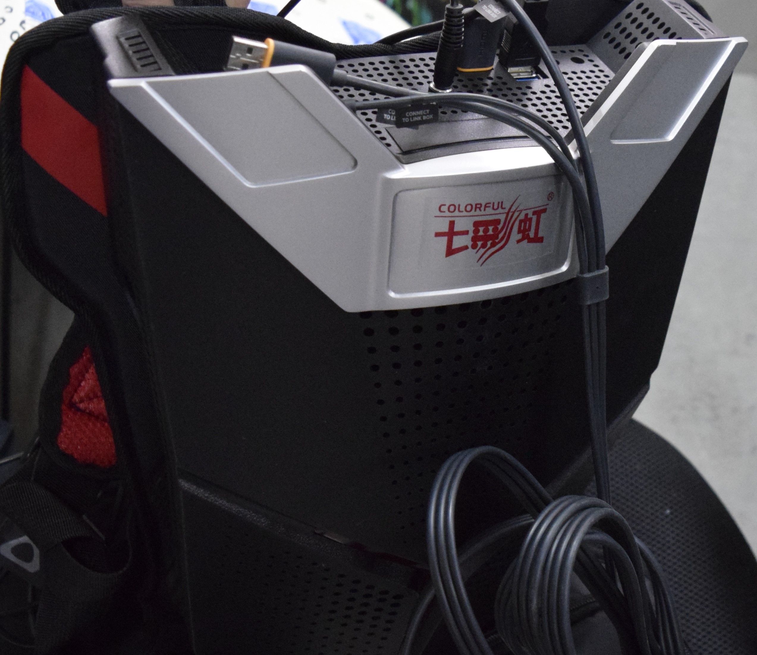 早在臺(tái)北電腦展上,七彩虹就推出了VR背包電腦,不過(guò)那時(shí)還沒有附帶移動(dòng)電源,所以無(wú)法對(duì)其測(cè)試。在短短的幾個(gè)月之后,七彩虹的VR背包電腦在中國(guó)發(fā)售。筆者有幸能夠在深圳一睹究竟。