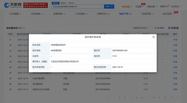天眼查App顯示,快手關(guān)聯(lián)公司北京達(dá)佳互聯(lián)信息技術(shù)有限公司AR表情錄制軟件獲得登記批準(zhǔn),登記號為2021SR2051435,批準(zhǔn)日期為2021年12月14日,目前版本號為V1.0。