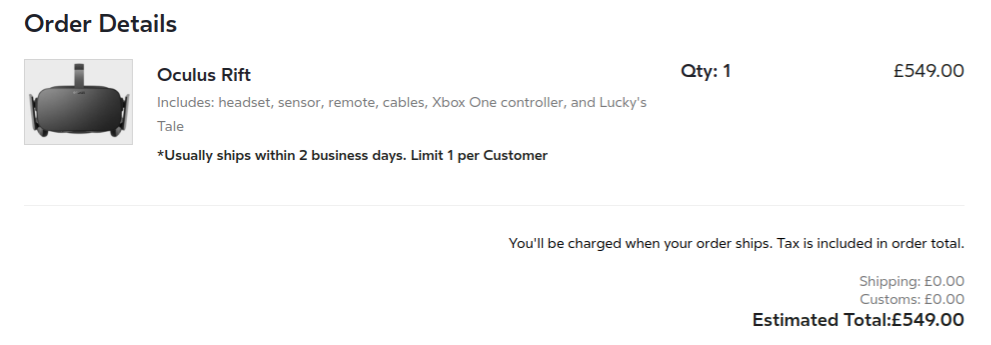 在上周的某個(gè)時(shí)刻,Oculus便已悄然將Rift的售價(jià)提高了50英鎊。因?yàn)樵谏现茉缧r(shí)候,外媒記者Jamie Feltham曾報(bào)道過(guò)歐洲零售商針對(duì)Rift的促銷活動(dòng)。那時(shí)Rift的售價(jià)仍是499英鎊,加上30英鎊的運(yùn)費(fèi)也才不過(guò)529英鎊。然而現(xiàn)在,英國(guó)訂單中單是Rift的售價(jià)就已經(jīng)提高到了549英鎊。截止至本月底,Oculus推出免運(yùn)費(fèi)的促銷活動(dòng),在活動(dòng)結(jié)束后運(yùn)費(fèi)將恢復(fù)為30英鎊,這也意味著,英國(guó)用戶要從Oculus的店里入手一臺(tái)Rift,需要花費(fèi)共計(jì)579英鎊。