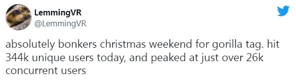 此外,獲得大量玩家青睞的熱門多人游戲「Gorilla Tag」在圣誕期間玩家總數(shù)達(dá)到34.4萬名,考慮到該游戲還沒有登陸Quest 2(App Lab)平臺,這已經(jīng)是一個非常了不起的成就。