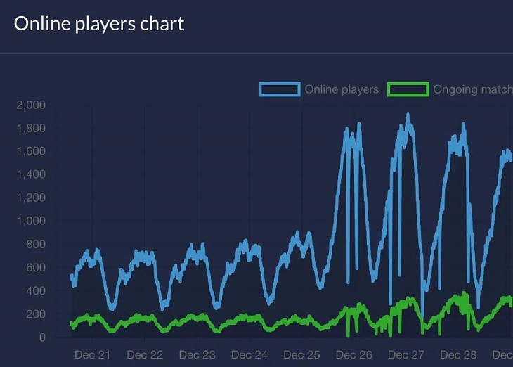 Twitter用戶@henrilatr透露「Eleven Table Tennis」12月21日至24日同時在線玩家數(shù)從800達(dá)到了1800+,截至28日,該在線人數(shù)峰值基本保持穩(wěn)定。