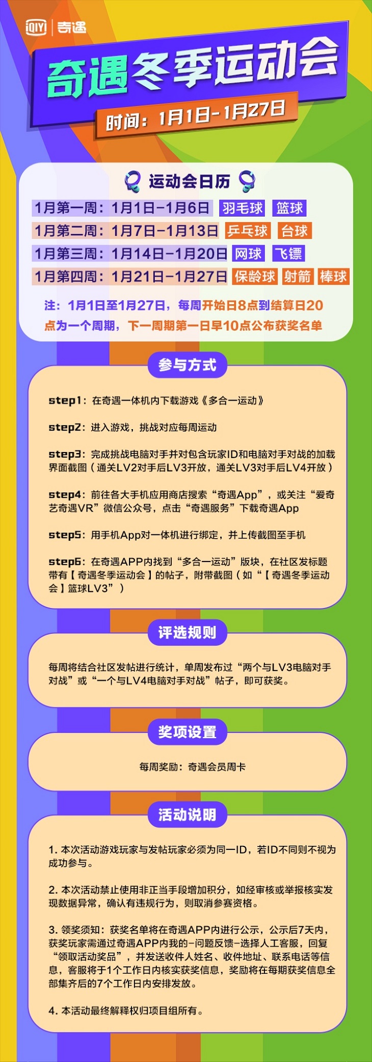 “奇遇冬季運動會”自2021年1月1日起至2022年1月27日,共分為四個挑戰(zhàn)周,每周挑戰(zhàn)奇遇官方指定的運動項目,例如運動會第一個挑戰(zhàn)周(1月1日至1月6日)平臺玩家將圍繞“羽毛球”和“籃球”兩大熱門項目展開。而擅長乒乓球、網(wǎng)球和射箭等項目的玩家也不要心急,后面三周的挑戰(zhàn)賽也勢必燃起宅家運動的汩汩熱血!
