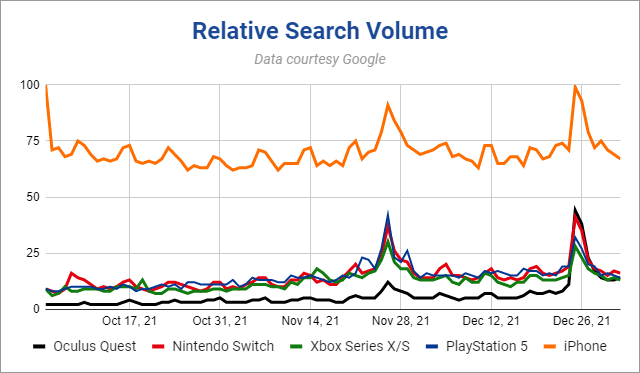 另一方面,雖然這個(gè)假期搜索Quest的人數(shù)比以往任何時(shí)候都多,但它即使在搜索高峰期仍然只有iPhone搜索量的一半左右。