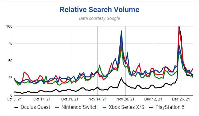 根據(jù)roadtovr報(bào)道,谷歌搜索數(shù)據(jù)顯示,Meta Quest(Oculus Quest)于2021圣誕以及元旦假期期間在美國的搜索量首次超越了PlayStation 5、Nintendo Switch以及Xbox等主要游戲主機(jī)。