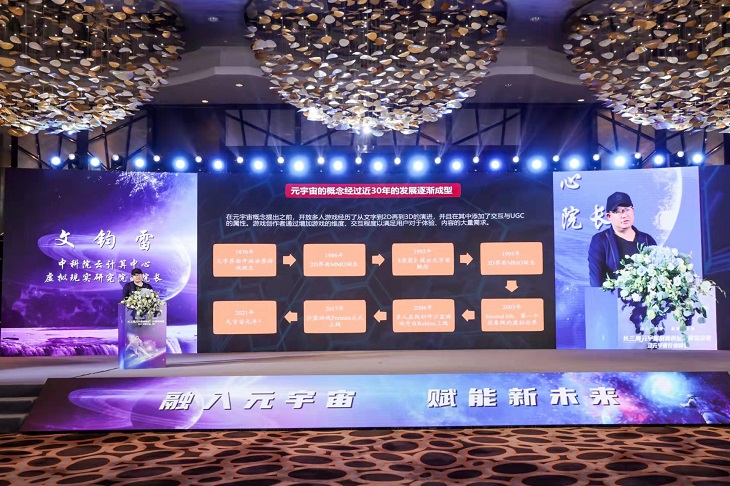 隨后,中科院云計算中心虛擬現(xiàn)實研究院副院長文鈞雷闡述了元宇宙近30年的發(fā)展過程,強調了元宇宙中的體驗要素。文院長認為,元宇宙本質上是復合型的產業(yè),也可以看作是是“VR+”的升級版本。在中端硬件的支持下,未來元宇宙產業(yè)終將爆發(fā)。