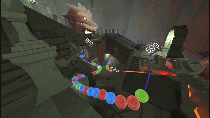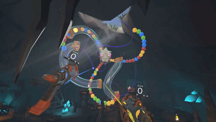 游戲玩法十分簡單,你只需操控左右手柄,將你手中不同顏色的球,射擊到合適的位置,讓同顏色的彩球連接消除即可,不過時間不等人,你需要盡快的做決定,爭取做到眼疾手快。在游戲中你可以一次性體驗到包含城堡、洞穴、影子山谷、詛咒神廟的四大章節(jié)。每一章節(jié)都有其獨特的關(guān)卡設(shè)置,你將通過VR感受和以往不一樣的世界。