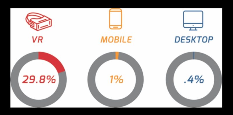 Immersv所搭建的平臺能夠追蹤用戶數(shù)據(jù),查看用戶是否在瀏覽嵌入在VR體驗(yàn)中的特定的廣告內(nèi)容。根據(jù)平臺數(shù)據(jù)顯示,廣告的點(diǎn)擊率(在VR里確切地說說是注視率)接近30%。相比之下移動端的這一數(shù)據(jù)只有1%,而電腦端的只有0.4%。