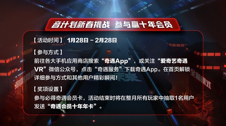此外,1月28日起,愛奇藝奇遇VR專門針對《樂動(dòng)未來·音計(jì)劃》舉辦的“音計(jì)劃新春挑戰(zhàn)賽”也正式開拔,活動(dòng)為期四周,一直持續(xù)到2月28日。想要參加的玩家只需在奇遇一體機(jī)內(nèi)下載游戲《樂動(dòng)未來·音計(jì)劃pro》,而后在規(guī)定時(shí)間內(nèi)完成挑戰(zhàn)對應(yīng)的運(yùn)動(dòng)模式,并將游戲分?jǐn)?shù)截圖/錄屏分享至【奇遇APP】的樂動(dòng)未來音計(jì)劃版塊。