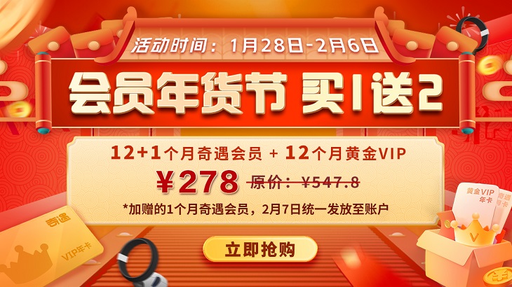 除此之外,“奇遇會(huì)員年貨節(jié)活動(dòng)”也同步進(jìn)行,持續(xù)時(shí)間為1月28日11:00至2月6日24:00。奇遇會(huì)員購買年卡降至278元,對比原價(jià)相當(dāng)于打了5折,并且購買一年的“奇遇會(huì)員年卡”還會(huì)送一年的“愛奇藝黃金VIP“再加送一個(gè)月”奇遇會(huì)員“,要知道一年黃金VIP的價(jià)格就相當(dāng)于百余元,所以這輪福利之大可想而知。